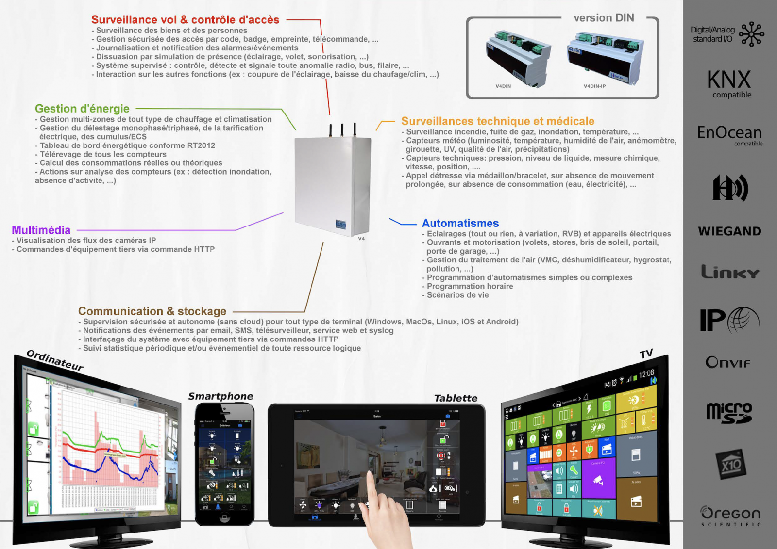 Ouverte sur les protocoles professionnels (Digital & Analog - standard I/O, KNX, EnOcean, Wiegand, Linky, Onvif, micro SD, X10, Oregon Scientific), Varuna4 est la réponse universelle adaptée pour le neuf et la rénovation de zones résidentielles, d’environnements collectifs, pépinières, PME et supporte l’implantation multi-sites.